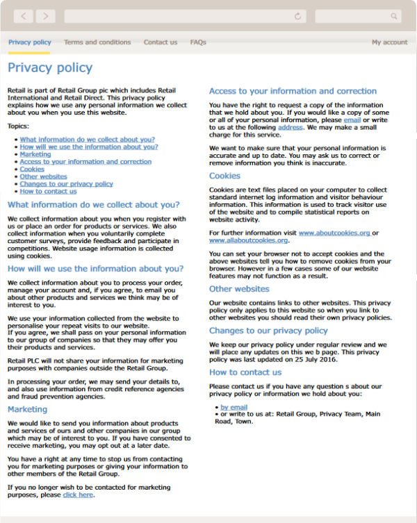 Your policy needs to be displayed in a prominent position on your website on every page - it should not be hidden away in sections such as ‘Contact Us’, for example.
