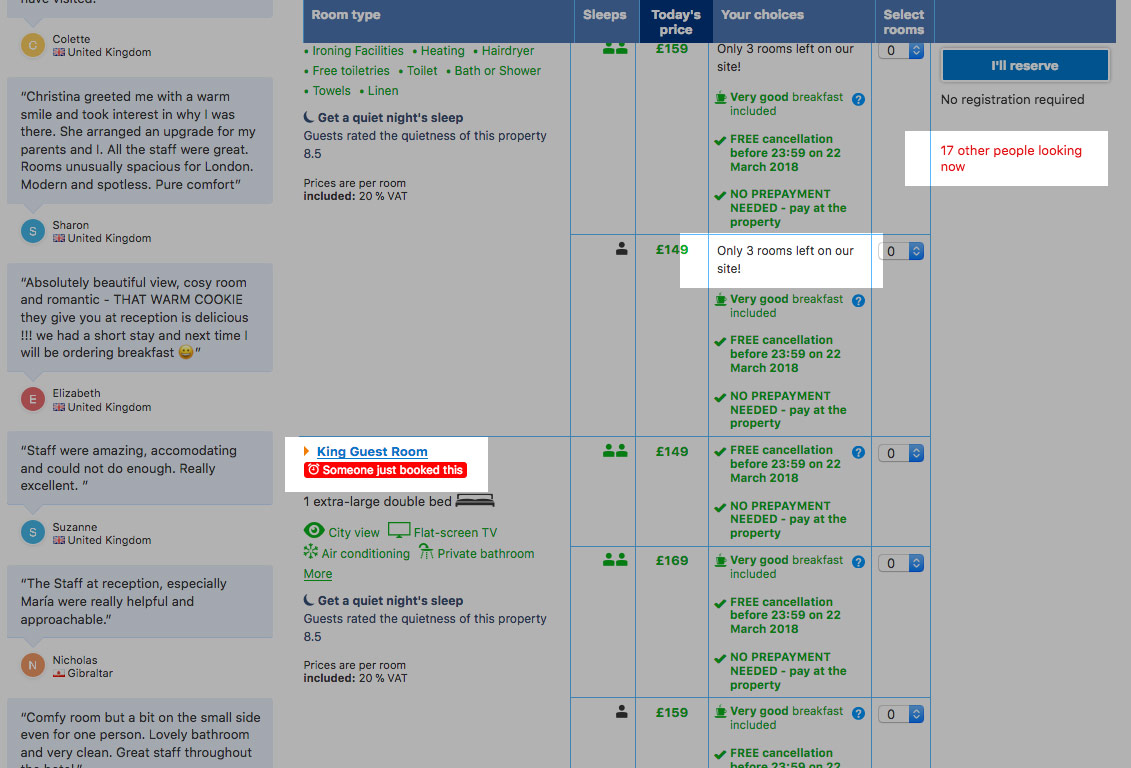 An example of this on a website, is the urgency message on hotel rooms or flights. The message that there are only four left at this price increase the impulse to buy.
